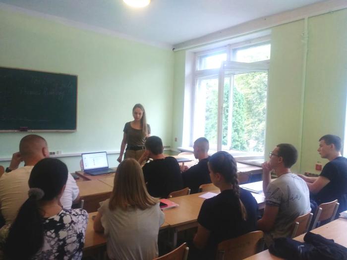 Старша викладачка кафедри іноземних мов факультету № 4 Тетяна Кальченко і старший інспектор з комунікації Кам’янець-Подільського районного управління поліції ГУНП в Хмельницькій області провели бінарне заняття з іноземної мови професійного спрямування для курсантів навчальної групи 205 факультету № 1.