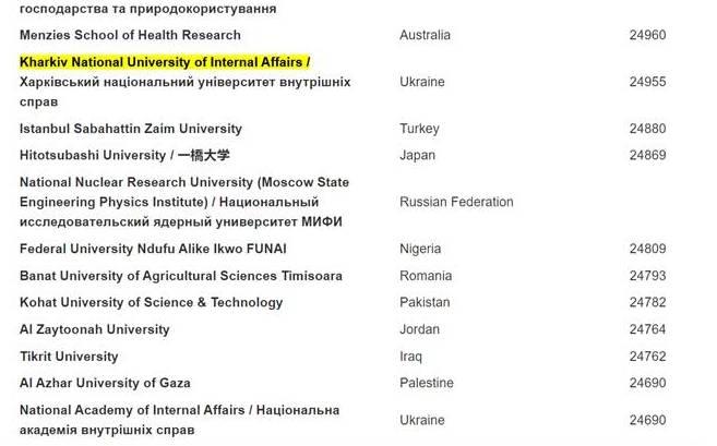 ХНУВС увійшов до рейтингу з показником цитованості 24955, збільшивши його у порівнянні з показником січневого випуску, майже на 3 тис. і посідає 32 місце. Це найкращій результат серед ЗВО МВС, які готують поліцейських.