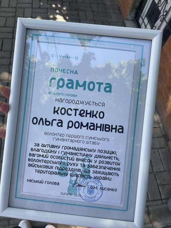 Студентка 3 курсу Сумської філії Харківського національного університету внутрішніх справ Ольга Костенко нагороджена Почесною грамотою Сумського міського голови за активну громадянську позицію, благодійну і гуманістичну діяльність, вагомий особистий внесок у розвиток волонтерського руху та забезпечення військових підрозділів, що захищають територіальну цілісність України.