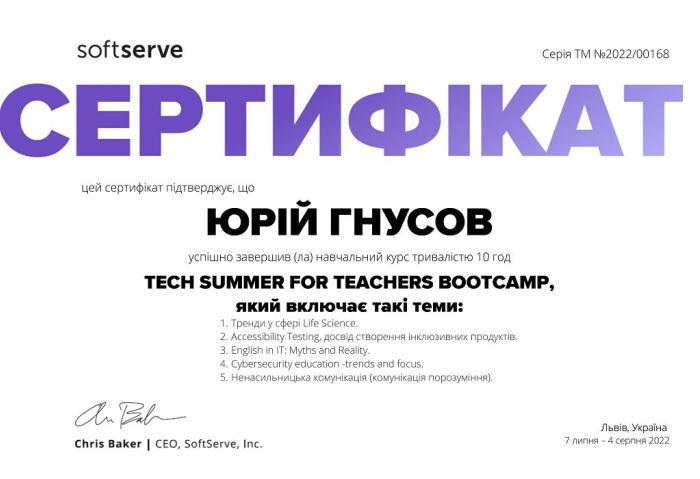У рамках підвищення кваліфікації завідувач кафедри кібербезпеки та DATA-технологій факультету № 6 Харківського національного університету внутрішніх справ Юрій Гнусов взяв участь у тренінгах «Teachers Smart-Up Summer 2022» та «Tech Summer For Teachers Bootcamp», що проводилися компаніями Sigma SoftServe та SoftServe.
