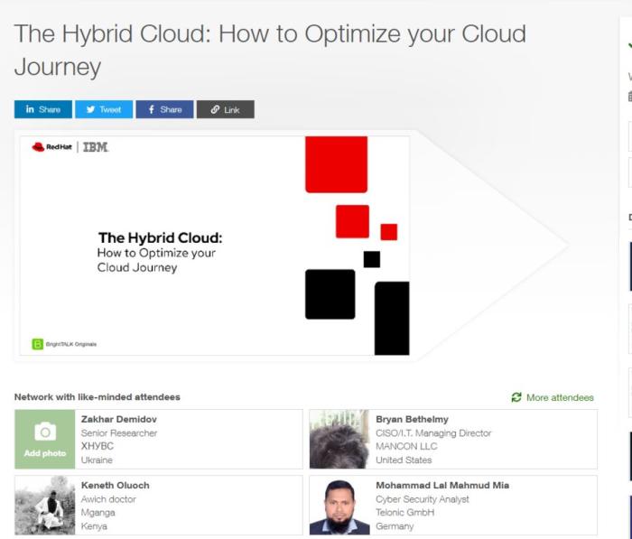 Під час вебінару було розглянуто питання про результати досліджень ESG щодо впровадження мультихмарних середовищ та перетворення додатків; основні вимоги при побудові гібридної хмарної архітектури та способи вимірювання успіху; поєднання рішень Red Hat з відкритим вихідним кодом та підходів IBM Consulting для захисту інвестицій в ІТ, а також забезпечення маневреності та гнучкості у гібридних хмарних середовищах.