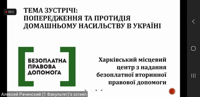 Школою наукового лідерства Харківського національного університету внутрішніх справ проведено третій вебінар на тему «Попередження та протидія домашньому насильству в Україні» у рамках співпраці з Харківським місцевим центром з надання безоплатної вторинної правової допомоги та сектором «Ізюмське бюро правової допомоги» Харківського місцевого центру з надання БВПД. Спікерами виступили заступниця директора Центру Лілія Йолкіна та завідувачка сектору «Ізюмське бюро правової допомоги» Харківського місцевого центру з надання БВПД Тетяна Хотетовська.