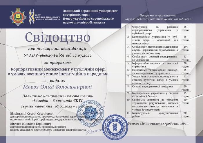 Завідувач кафедри цивільного права та процесу факультету № 6 Юрій Жорнокуй, доцент цієї ж кафедри кандидат юридичних наук, доцент Ольга Мороз та професор кафедри правового забезпечення підприємницької діяльності та фінансової безпеки факультету № 6 Валентина Жорнокуй пройшли навчання у рамках підвищення кваліфікації за програмою «Корпоративний менеджмент у публічній сфері в умовах воєнного стану: інституційна парадигма».