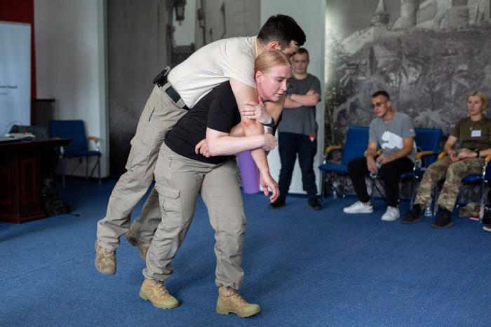 Крім того, учасники та учасниці тренінгу дізналися про основні складові TFC (Tactical Field Care), про підходи до допомоги в різних тактичних умовах, на практиці вчилися прийомам тампонади поранень, накладання тиснучого бандажу (ізраїльський бандаж), надання допомоги за алгоритмом MARCH.