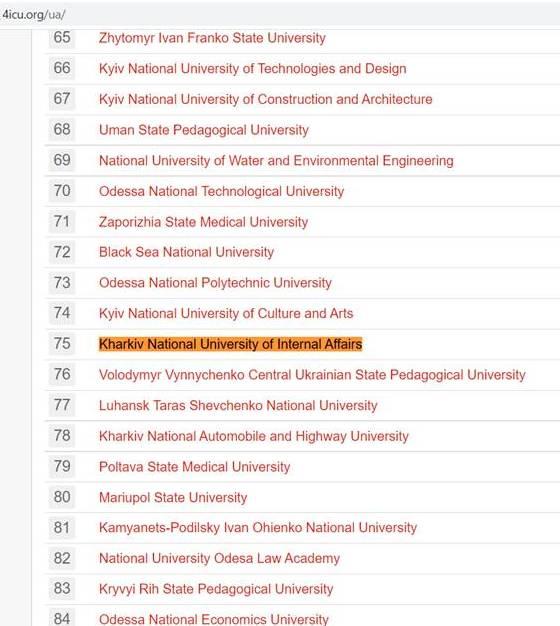 Черговий рейтинг університетів 2022 року охоплює 185 українських ЗВО, у тому числі й три університети системи МВС, серед яких Харківський національний університет внутрішніх справ має найкращий результат і посідає 75 місце.