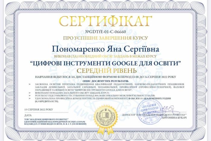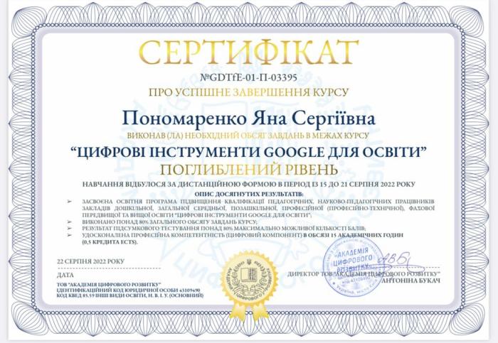 Доцентка кафедри соціології та психології факультету № 6 кандидатка психологічних наук Яна Пономаренко успішно пройшла навчання за освітньою програмою підвищення кваліфікації педагогічних та науково-педагогічних працівників закладів освіти «Цифрові інструменти Gооglе для освіти» (цифровий компонент).