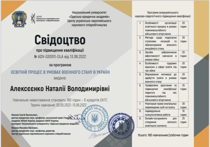 Старша викладачка кафедри соціології та психології факультету № 6 Наталя Алексєєнко взяла участь у всеукраїнському науково-педагогічному підвищенні кваліфікації Національного університету «Одеська юридична академія» та успішно пройшла навчання за програмою «Освітній процес в умовах воєнного стану в Україні». Було проаналізовано та надано практичні поради щодо проведення освітнього процесу в умовах воєнного стану. Програма підвищення кваліфікації була спрямована на розвиток та удосконалення юридичної, психолого-педагогічної, комунікативної, інформаційно-комунікаційної компетентностей, а також практичних умінь та навичок інтерактивної взаємодії та професійно-особистісного розвитку для підвищення ефективності професійного спілкування та здійснення педагогічної діяльності.