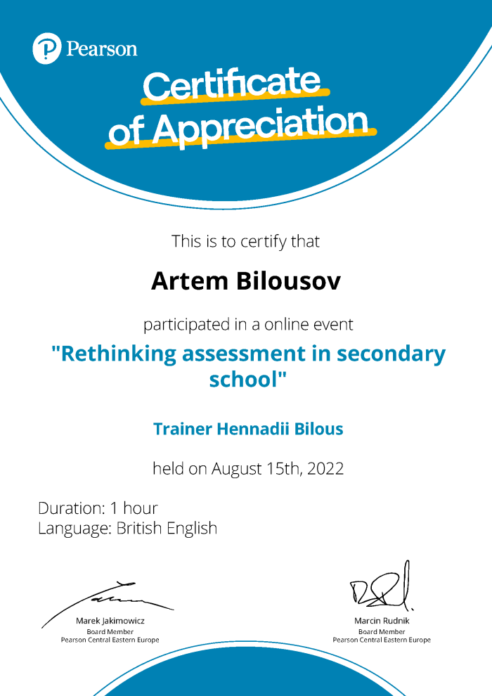 Використання цифрових технологій під час навчання є сталою частиною освітнього процесу покоління XXI століття. З метою створення ефективного цифрового простору представники кафедри іноземних мов факультету № 4 ХНУВС завідувачка кафедри Олена Статівка, доценти цієї ж кафедри Валентина Почуєва та Олег Гончарук, старша викладачка Лариса Сазанова і викладач Артем Білоусов взяли участь у міжнародному онлайн-вебінарі «Rethinking assessment in secondary school» від Pearson, де були розглянуті такі питання, як сучасні навчальні мобільні додатки та цифрові платформи, переваги використання онлайн-ресурсів для вивчення іноземних мов, алгоритм роботи з відеоматеріалами, відпрацювання лексики та граматики, дидактичні ігри.