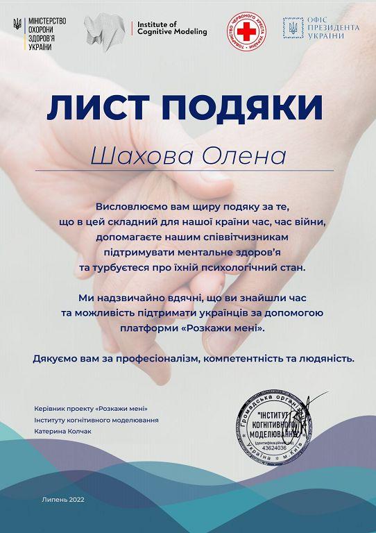 Доцент кафедри соціології та психології, психолог і психотерапевт у гештальт-підході Олена Шахова у складі команди висококваліфікованих психологів допомагає нашим співвітчизникам підтримувати ментальне здоров’я, працюючи на безкоштовній інтернет-платформі психологічної допомоги «Розкажи мені».