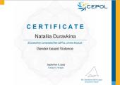 Доцентка кафедри юридичних дисциплін Сумської філії ХНУВС Наталія Дуравкіна пройшла освітній модуль «Gender-based Violence», який було організовано та проведено Агентством Європейського Союзу з навчання правоохоронних органів «CEPOL».