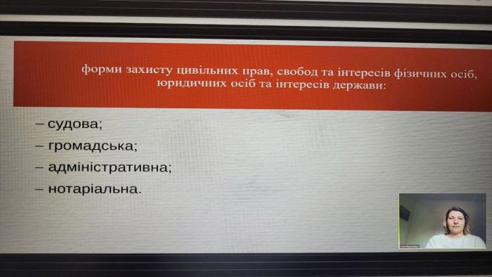Доцент кафедри цивільного права та процесу факультету № 6 Елла Вакулович провела онлайн лекцію для студентів 4 курсу спеціальності «Правоохоронна діяльність» з дисципліни «Цивільний процес» за темою «Судова влада і правосуддя в цивільних справах». Під час лекції було розкрито питання щодо форм захисту цивільних прав та інтересів, судової системи України та переваг судової форми захисту. Лекція супроводжувалася демонстрацією презентації та ознайомленням з веб-ресурсами судової влади України.