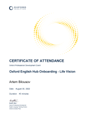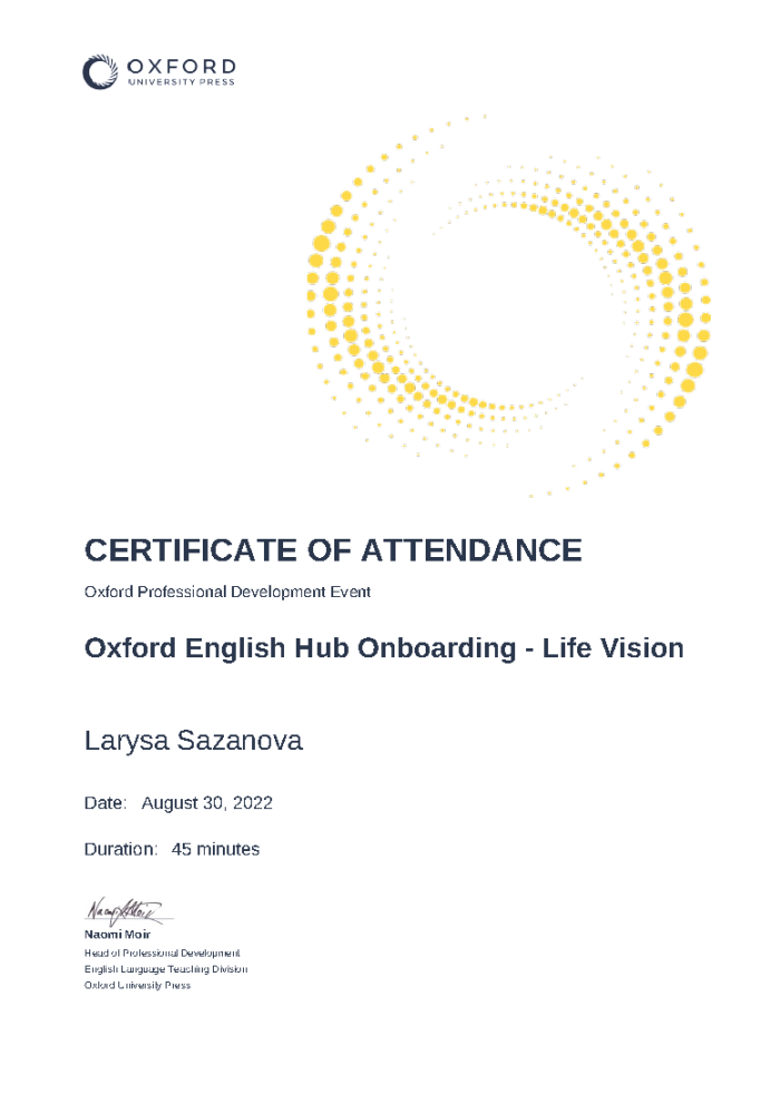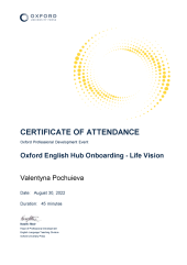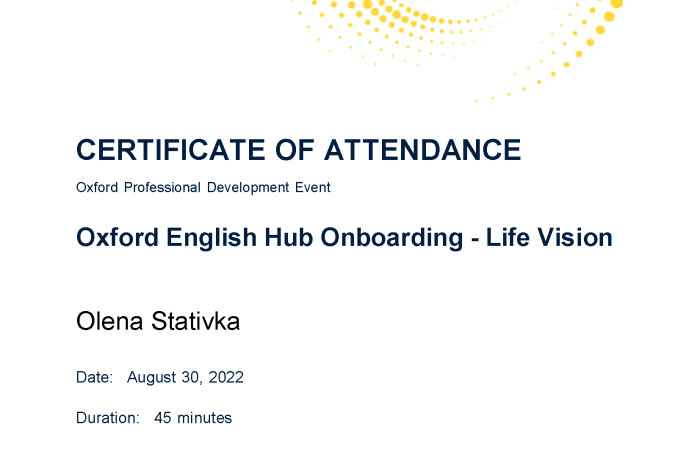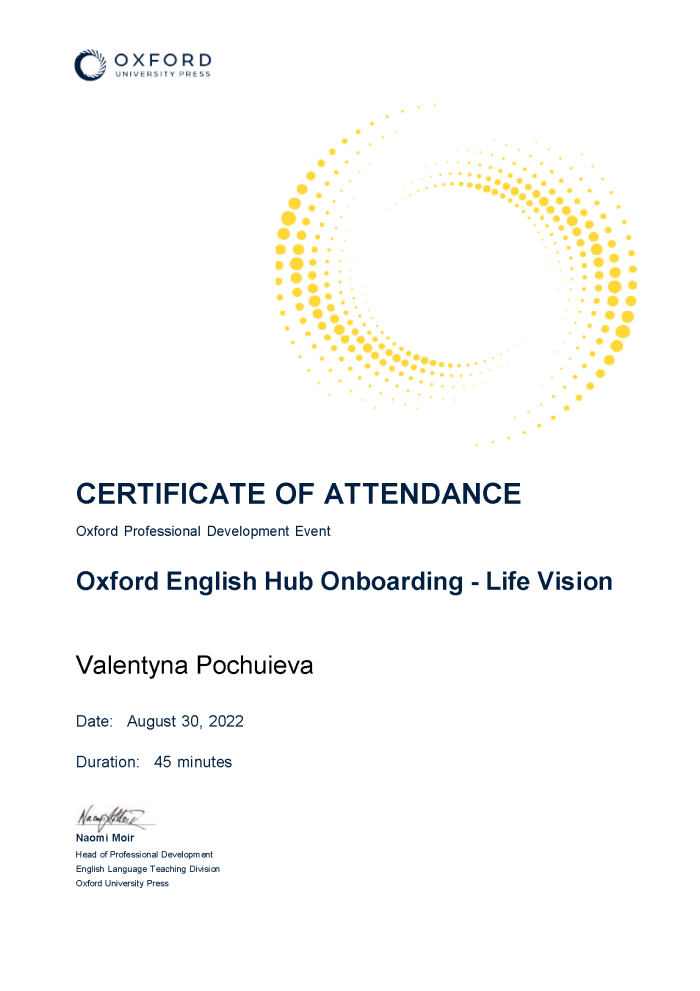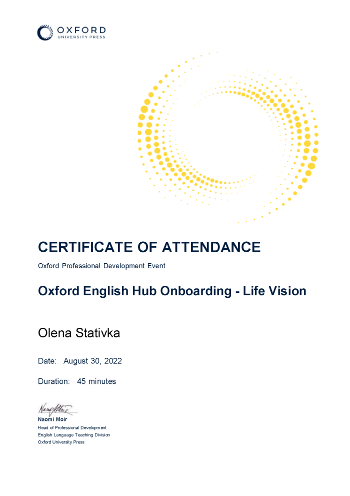 Завідувачка кафедри іноземних мов факультету № 4 Олена Статівка та викладачі цієї ж кафедри Валентина Почуєва, Лариса Сазанова, Наталія Горбач, Олег Гончарук та Артем Білоусов взяли участь у міжнародному онлайн-вебінарі «Oxford English Hub Onboarding – Life Vision» від Oxford University Press.