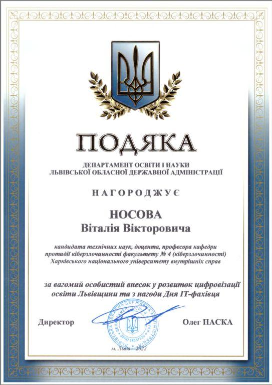Професор кафедри протидії кіберзлочинності факультету № 4 Харківського національного університету внутрішніх справ кандидат технічних наук, доцент Віталій Носов отримав Подяку від Департаменту освіти і науки Львівської обласної військової адміністрації за вагомий особистий внесок у розвиток цифровізації освіти Львівщини та з нагоди Дня ІТ-фахівця.