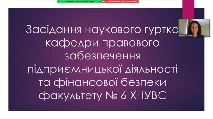 Відбулося oнлайн-засідання студентського наукового гуртка кафедри правового забезпечення підприємницької діяльності та фінансової безпеки факультету № 6 на чолі з його керівником – професором кафедри Юлією Кириченко.