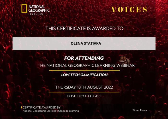 Завідувачка кафедри іноземних мов факультету № 4 Олена Статівка та викладачі цієї ж кафедри Валентина Почуєва, Лариса Сазанова, Олег Гончарук та Артем Білоусов взяли участь у міжнародному онлайн-вебінарі “Low-tech gamification” від “National Geographic” зі спікеркою Фло Фіст, яка ознайомила учасників заходу з найновішим курсом англійської для студентів – підручником Voices, що навчає використовувати англійську для міжнародного спілкування в різних ситуаціях.