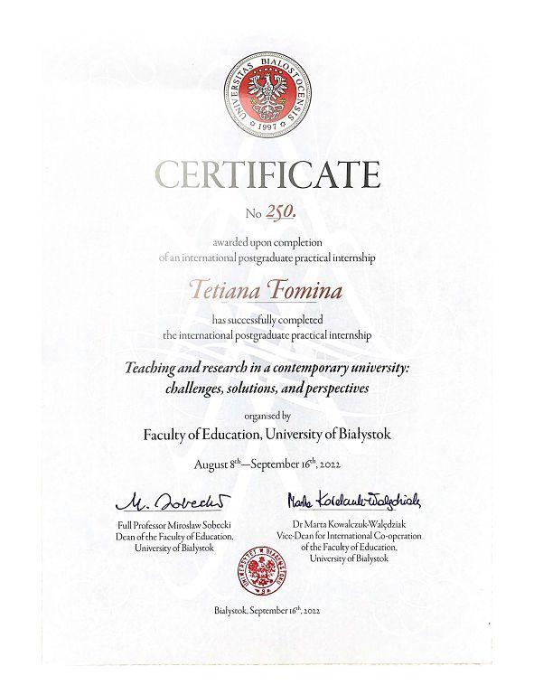 Доцент кафедри кримінального процесу та організації досудового слідства факультету № 1 доктор юридичних наук, доцент Тетяна Фоміна пройшла міжнародне онлайн-стажування для викладачів закладів вищої освіти від Білостоцького державного університету (Польща). Тема стажування - «Навчально-наукова діяльність в сучасному університеті: виклики, рішення, перспективи».