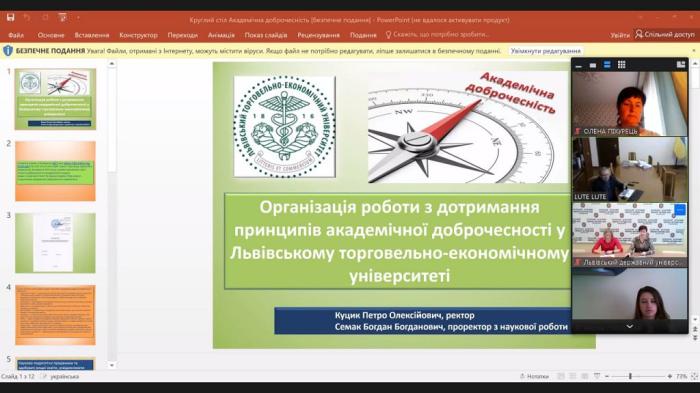 Працівники та курсанти факультету № 4 Харківського національного університету внутрішніх справ: доценти кафедри цивільно-правових дисциплін кандидати юридичних наук, доценти Олена Піхурець та Олександр Шишка, курсанти факультету № 4 Станіслав Павленко, Ярослав Єрьоменко, курсант Аміна Головня, Єлізавета Сенченко, старша наукова співробітниця відділення організації наукової роботи відділу організації наукової діяльності та захисту інтелектуальної власності Катерина Маравська взяли участь у засіданні круглого столу “Дотримання академічної доброчесності в закладах вищої освіти”, який проводився на базі Львівського державного університету внутрішніх справ. Катерина Маравська виступила із доповіддю “Дотримання принципів та правил академічної доброчесності в Харківському національному університеті внутрішніх справ в умовах воєнного стану”. Учасники круглого столу обговорили питання із дотримання правил академічної доброчесності в освітньому процесі закладами вищої освіти; використання онлайн-сервісу Unicheck для перевірки академічних текстів на плагіат; особливості застосування нових функцій антиплагіатної системи Strike Plagiarism тощо.