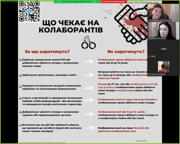 Викладачки кафедри фундаментальних та юридичних дисциплін факультету № 6 ХНУВС Ксенія Гуртова та Наталія Чорногор провели для студентів своїх кураторських груп спільну онлайн-зустріч на актуальну тему сьогодення «Колабораційна діяльність на території України». Студентам продемонстрували тематичні слайди, також обговорили з ними небезпеку такої співпраці та її наслідки відповідно до кримінального законодавства.