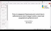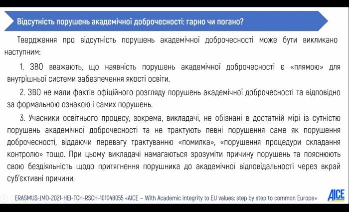 Під час вебінару учасники дізналася про проблеми забезпечення академічної доброчесності у вищій освіті в умовах кризи; проблему дотримання деякими закладами вищої освіти України політики нульової толерантності до порушень академічної доброчесності; питання, пов’язані із підготовкою законопроєкту про академічну доброчесність тощо.