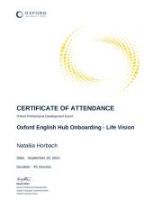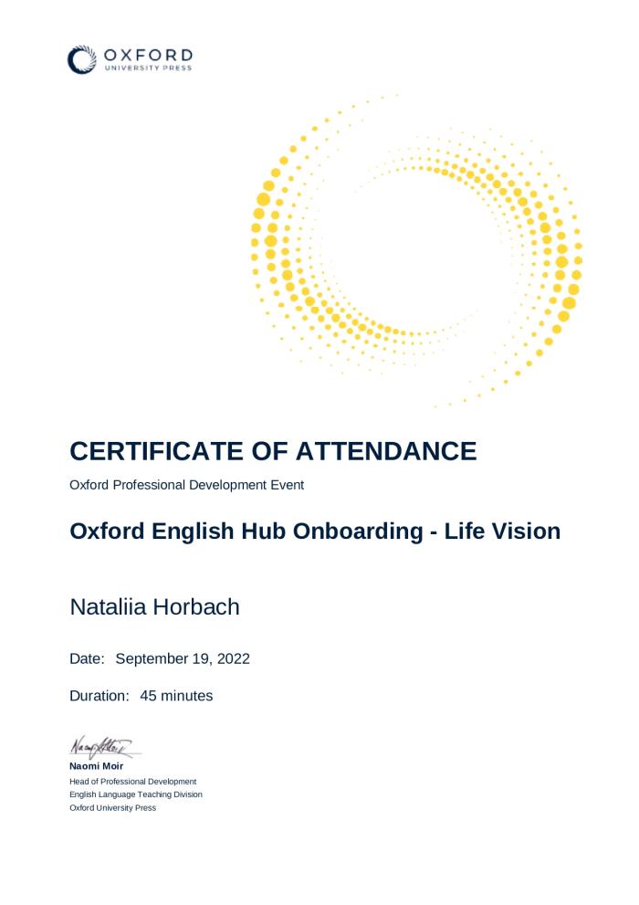 Старша викладачка кафедри іноземних мов Наталія Горбач взяла участь у міжнародному онлайн-вебінарі «Oxford English Hub Onboarding – Life Vision» від Oxford University Press, ознайомилася з платформою «Oxford English Hub Onboarding», цифровими матеріалами та ресурсами для набуття навичок, необхідних для складання іспиту CEFR (Загальноєвропейські компетенції володіння іноземною мовою з перевірки знань з англійської мови. За результатами вебінару отримано сертифікат учасника.