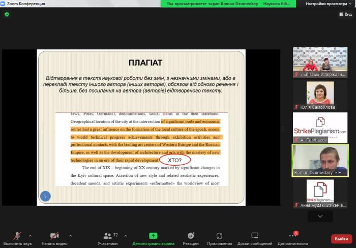 Доцентка кафедри гуманітарних дисциплін Сумської філії Харківського національного університету внутрішніх справ Юлія Самойлова взяла участь у засіданні круглого столу на тему «Дотримання академічної доброчесності в закладах вищої освіти», що був проведений на платформі Zoom Львівським державним університетом внутрішніх справ.