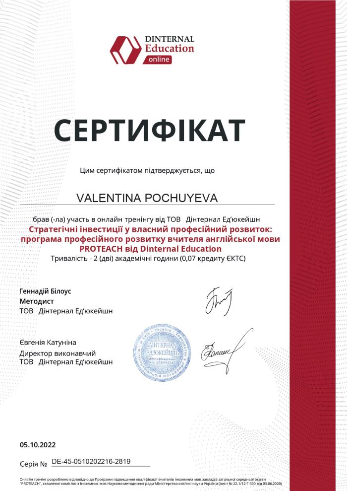 Доцентка кафедри іноземних мов факультету № 4 ХНУВС Валентина Почуєва взяла участь в онлайн-тренінгу «Стратегічні інвестиції у власний професійний розвиток: програма професійного розвитку вчителя англійської мови PROTEACH від ТОВ «Дінтернал Ед’юкейшн».