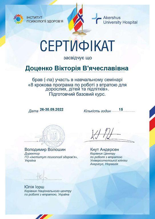 Доцентка кафедри педагогіки та психології факультету № 3 ХНУВС Вікторія Доценко успішно пройшла навчальний семінар «8-ми крокова програма по роботі з втратою для дорослих, дітей та підлітків». Навчання організовано та проведено ГО «Інститут психології здоров'я» (Україна), Національним центром по роботі з втратою (Україна), Центром по роботі з втратою Університетської кліники Акергсус (Норвегія).