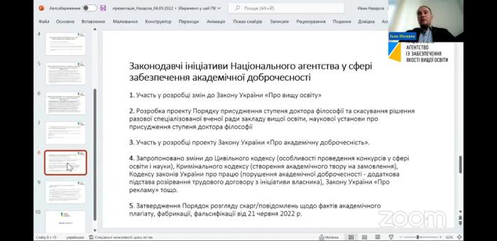 Під час форуму учасники отримали цінну та цікаву інформацію про розвиток академічної доброчесності в Україні. Зокрема, були розглянуті важливі для освітян питання: система забезпечення академічної доброчесності у закладі вищої освіти на шляху до світових стандартів та її зовнішня оцінка в умовах кризи; дотримання деякими закладами вищої освіти України політики нульової толерантності до порушень академічної доброчесності; законодавчі ініціативи з метою підвищення академічної доброчесності у науці та освіті; підготовка законопроєкту про академічну доброчесність; академічна доброчесність і застосування інформаційних технологій; види академічної відповідальності (у тому числі додаткові та/або деталізовані) учасників освітнього процесу за конкретні порушення академічної доброчесності тощо.