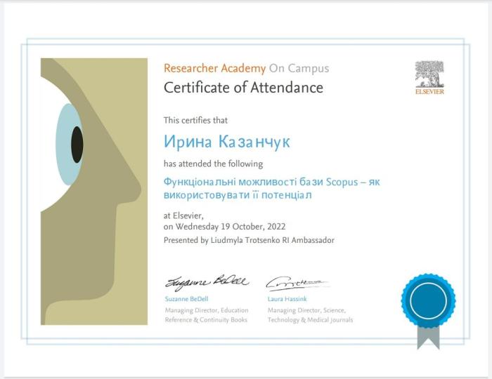 В рамках покращення науково-дослідної діяльності доцентка кафедри адміністративного права та процесу факультету № 1 Ірина Казанчук підвищила кваліфікацію, дистанційно взявши участь у навчальному онлайн-вебінарі на тему «Функціональні можливості наукометричної бази Scopus – як використовувати її можливості», організованому Elsevier за підтримки Міністерства освіти і науки України. Навчання відбувалося англійською та українською мовами за допомогою платформи BrightTALK.