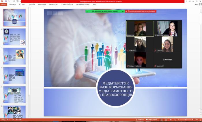 Старша викладачка кафедри українознавства факультету № 2 ХНУВС Наталія Єльнікова у межах Всесвітнього тижня медіа та інформаційної грамотності (Global MIL Week) провела з курсантами третього курсу кураторську годину за темою «Медіатекст як засіб формування медіаграмотності у майбутніх правоохоронців». Увагу учасників заходу було закцентовано на тому, що медіапростір надає змогу не тільки знайти потрібну інформацію, а й визначити вектор освіти, формуючи ставлення до професії через медійний образ правничої сфери та її місця в соціумі. Під час зустрічі виникло чимало дискусійних питань, консенсусу дійшли в тому, що убезпечити медіапростір в сучасних умовах формування медіаграмотності громадян можливо через генерування критичного мислення правоохоронців і верифікацію інформації в медіапросторі.