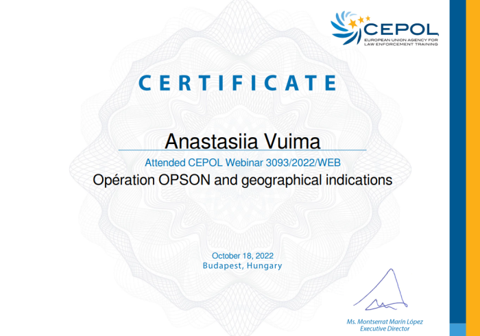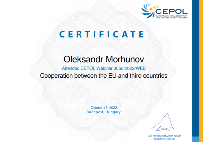 Протягом останнього часу представники Харківського національного університету внутрішніх справ прослухали вебінари – «Information provision in the context of access to the asylum procedure», «Cooperation between the EU and third countries», «Law enforcement activities and data protection II», «The EU Terrorism Situation and Trend Report (TE-SAT) 2022 - methodology, process and findings», «Operation OPSON and geographical indications» тощо.