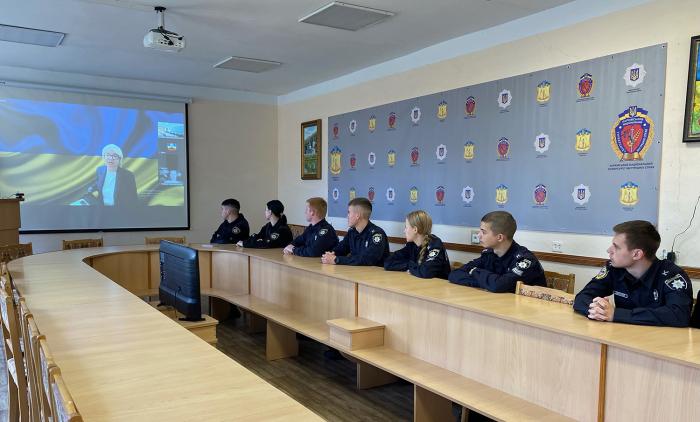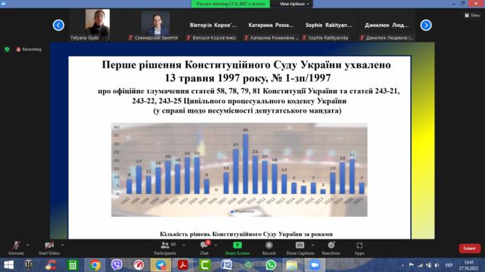 Актив курсантсько-студентського самоврядування ХНУВС також прослухав онлайн-лекцію, яку проводили представники Конституційного суду України, зокрема суддя Галина Юровська. Слухачі лекції пройшли тест на знання історії судової інституції, дізналися цікаві факти та особливості формування української судової системи.