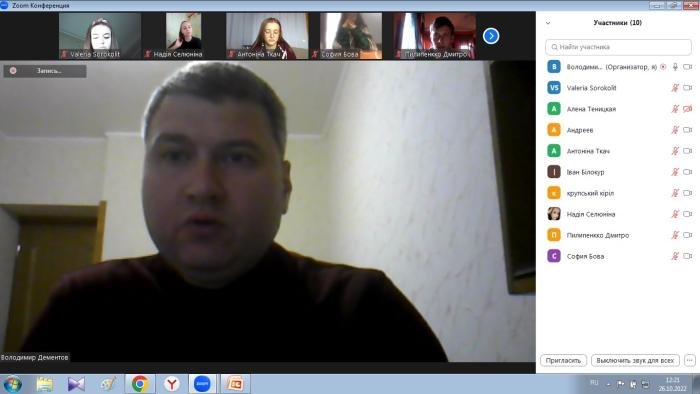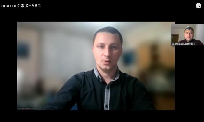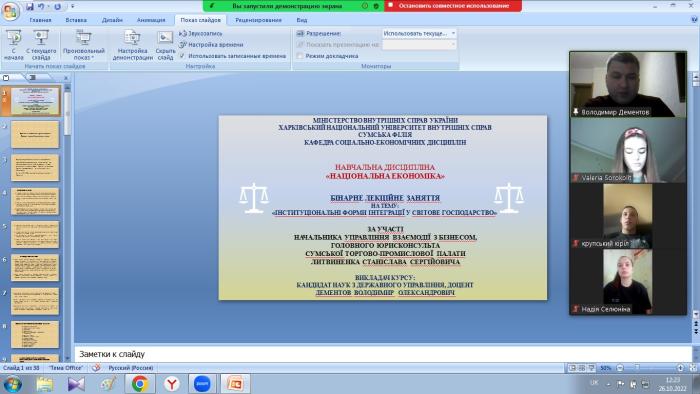 Доцент кафедри соціально-економічних дисциплін Сумської філії ХНУВС Володимир Дементов спільно з начальником управління взаємодії з бізнесом, головним юрисконсультом Сумської торгово-промислової палати Станіславом Литвиненком провели для студентів 2 курсу, які навчаються за спеціальністю «Право», бінарне лекційне заняття онлайн із навчальної дисципліни «Національна економіка» на тему «Інституціональні форми інтеграції у світове господарство».