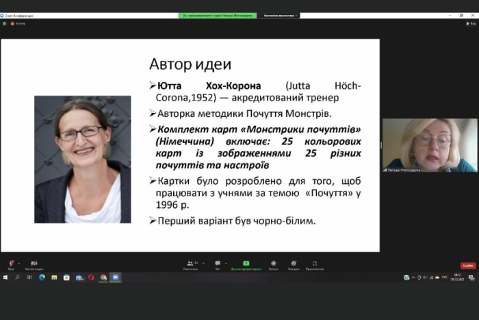 Наталія Мілорадова провела майстер-клас за темою «Використання метафоричних асоціативних карт (МАК) «Монстрики почуттів» в індивідуальній та груповій роботі психолога». Під час майстер-класу було розглянуто можливості використання МАК «Монстрики почуттів» в індивідуальній та груповій роботі, базові прийоми та правила роботи, механізми дії МАК, прийоми та техніки використання колоди в консультативній практиці та можливості її використання в онлайн-консультуванні.