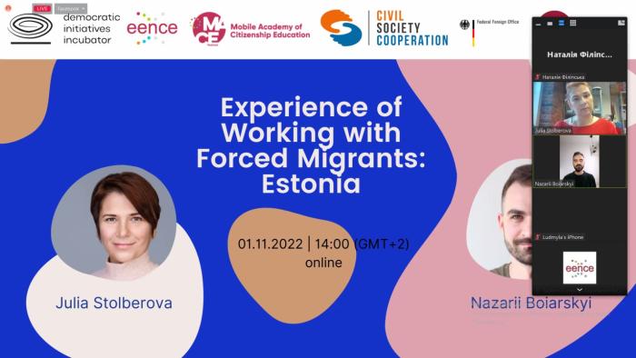 Старша викладачка кафедри конституційного і міжнародного права факультету № 4 Наталія Філіпська взяла участь у вебінарі за темою «Experience of Working with Forced Migrants: Estonia», організованому та проведеному НГО «Democratic Initiatives Incubator» у рамках проєкту «The Response of Citizenship Education to the Challenges of Forced Migration». Вебінар проводився англійською мовою. Лекторкою виступила освітня юристка, волонтерка, засновниця НГО «Special World» та «Vivere school», активна громадська діячка Юлія Столберова. Вона поділилася досвідом Естонії щодо надання допомоги мігрантам, зокрема й з України, сприяння їх інтеграції у суспільство. Особливу увагу було приділено питанням інклюзії та роботі з мамами дітей з особливостями психофізичного розвитку.