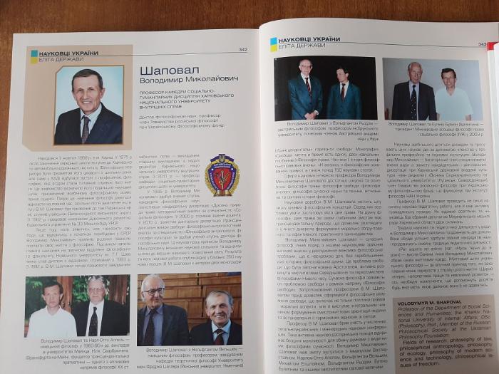 У виданні «Науковці України – еліта держави» надруковано статтю про професора кафедри соціально-гуманітарних дисциплін факультету № 6 Харківського національного університету внутрішніх справ доктора філософських наук, професора Володимира Миколайовича Шаповала (Науковці України – еліта держави. Том VII).