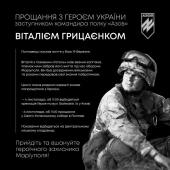 6 листопада об 11.00 прощання пройде у Свято-Успенському соборі у місті Полтава. Поховання відбудеться на Центральному міському кладовищі, де рідні, побратими та друзі зможуть нарешті попрощатися з Героєм. 19 березня Віталій Грицаєнко загинув під час оборони Маріуполя.