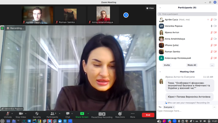 Для здобувачів вищої освіти 1 курсу факультету № 6 Харківського національного університету внутрішніх справ доцентка кафедри правового забезпечення підприємницької діяльності та фінансової безпеки факультету № 6 Ірина Антол та юристка Вероніка Попова провели бінарне заняття за темою «Особливості фінансово-економічної безпеки в Німеччині та Україні у воєнний час» з навчальної дисципліни «Управління фінансово-економічною безпекою».