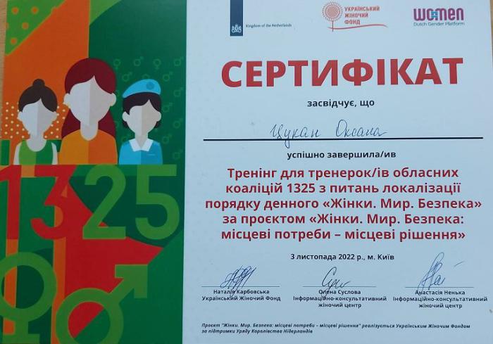 Помічниця ректора з гендерних питань кандидат юридичних наук, доцент Цукан Оксана стала сертифікованою тренеркою для обласних коаліцій 1325 з питань локалізації Національного плану дій «Жінки. Мир. Безпека».