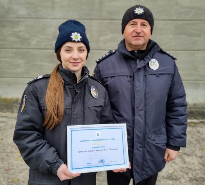 За сумлінне ставлення до виконання посадових обов'язків, ініціативу та наполегливість Подяку МВС України отримала курсантка 3 курсу капрал поліції Юлія Сарваєва.