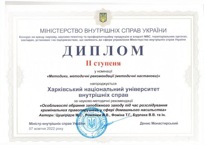 Під час ранкового шикування курсантів факультету № 1 Харківського національного університету внутрішніх справ декан факультету полковник поліції Олександр Музичук вручив Диплом ІІ ступеня завідувачу кафедри кримінального процесу та організації досудового слідства кандидату юридичних наук, доценту Віталію Романюку за перемогу у конкурсі на кращу наукову, науково-технічну та профорієнтаційну продукцію в апараті МВС, територіальних органах, закладах, установах і підприємствах, що належать до сфери управління МВС України у номінації «Методики, методичні рекомендації (методичні настанови)» за науково-методичні рекомендації «Особливості обрання запобіжного заходу під час розслідування кримінальних правопорушень у сфері домашнього насильства» (автори: Цуцкірідзе М.С., Романюк В.В., Фоміна Т.Г., Бурлака В.В. та ін.).