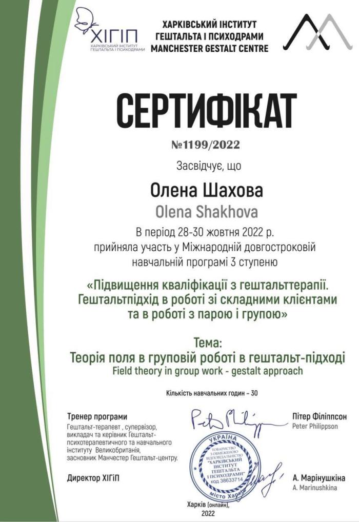 Доцентка кафедри соціології та психології Харківського національного університету внутрішніх справ кандидатка біологічних наук Олена Шахова пройшла міжнародне дистанційне підвищення кваліфікації в межах міжнародної довгострокової освітньої програми «Підвищення кваліфікації з гештальт-терапії. Гештальтпідхід у роботі зі складними клієнтами та в роботі з парою і групою».