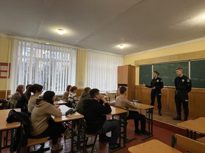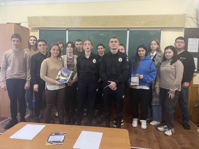 Студентка факультету № 6 Харківського національного університету внутрішніх справ Юлія Глушкова разом із курсантами 1 курсу факультету № 1 Яною Мельник і Дмитром Ковалем за сприяння кафедри соціології та психології провели профорієнтаційну роботу у Кам’янець-Подільській гімназії № 14, де поспілкувалися зі старшокласниками.