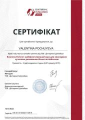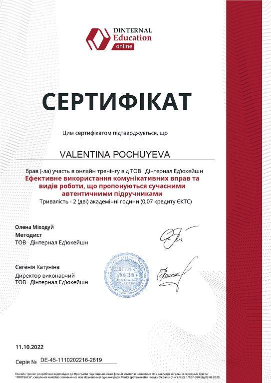За результатами тренінгу Валентина Почуєва отримала навички визначення основних критеріїв при виборі автентичного ресурсу для викладання загальної англійської та бізнес англійської дорослій аудиторії, варіювання групової та парної роботи під час організації комунікативних видів вправ та враховування особливостей роботи з дорослою аудиторією при плануванні занять.