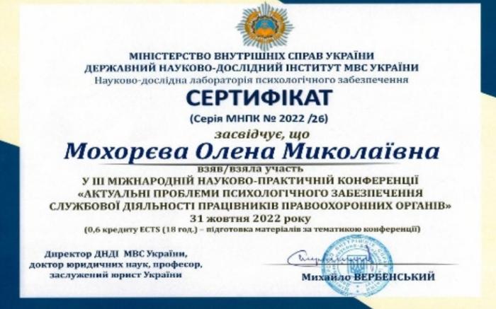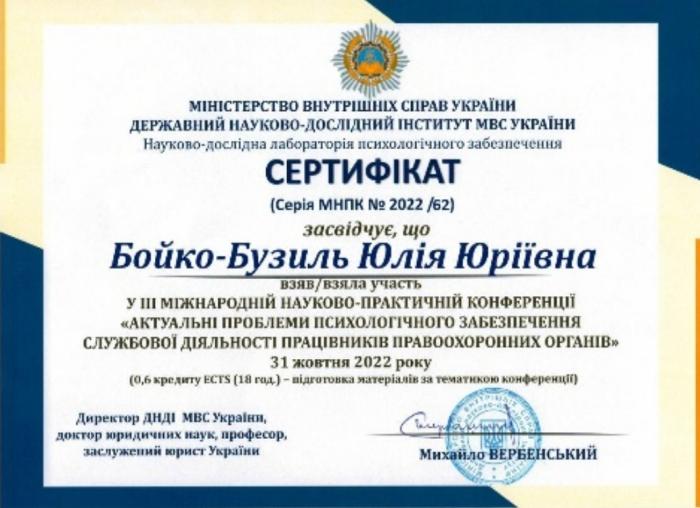 Викладачі кафедри соціології та психології Юрій Александров, Юлія Бойко-Бузиль та Олена Мохорєва взяли участь у ІІІ Міжнародній науково-практичній конференції «Актуальні проблеми психологічного забезпечення службової діяльності працівників правоохоронних органів».