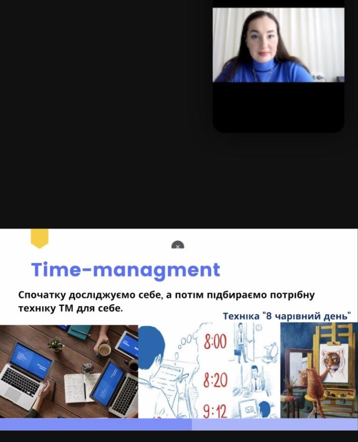На занятті обговорювалися наступні питання: «Що заважає бути продуктивним», «Що допомагає бути продуктивним», «Самодисципліна формування нових звичок».