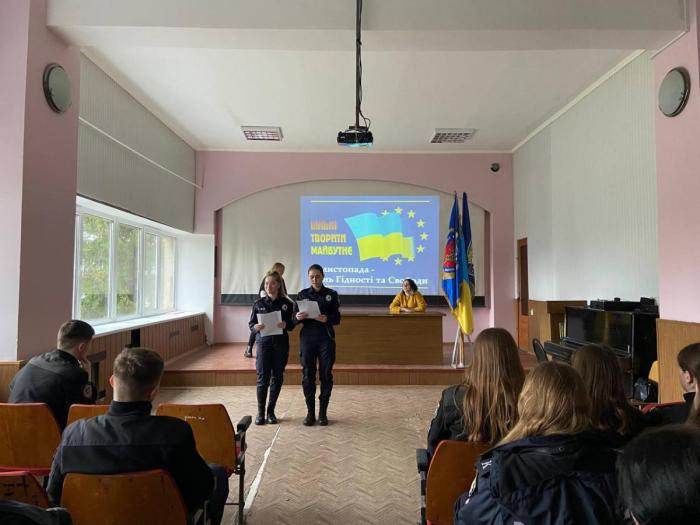 Курсантки 3 курсу Єлизавета Шевцова та Марина Шака також підготували доповідь про події, які відбувалися в країні у 2004 році і на Майдані Незалежності у 2013-2014 роках. Вони разом із курсантами хвилиною мовчання вшанували пам'ять усіх загиблих під час Революції Гідності.