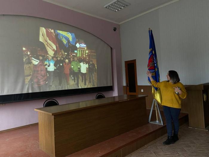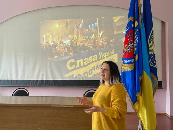 Провідна фахівчиня відділу організації виховної роботи Ганна Мітітєл звернулася до курсантів словами: «Це був надзвичайно важкий іспит для України, коли українці продемонстрували свою європейськість, гідність, своє прагнення до свободи, ми повинні з вами пам’ятати ті цінності, які відстоювали учасники українських революцій, та за які сьогодні воюють захисники і захисниці у російсько-українській війні: незалежність та територіальну цілісність, волю, соборність, гідність України та українців».