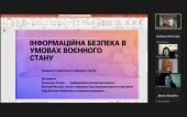 На кафедрі соціально-економічних дисциплін відбулось чергове засідання наукового гуртка на тему «Інформаційна безпека в умовах воєнного стану» у форматі онлайн-відеоконференції. У заході взяли участь студенти, які працювали над науковими працями, теми яких дотичні до вказаної теми, учасники студентських конференцій, члени кафедри соціально-економічних дисциплін. Із доповідями виступили студентки-першокурсниці: Вікторія Рудь за темою «Небезпека в соціальних мережах», Тетяна Бєльченко - «Інформаційні системи для юриста» та Вікторія Мозгова - «Захист інформації від несанкціонованого втручання». У доповідях розглядалися основні принципи побудови інформаційних систем та їх класифікація, останні розробки програмного забезпечення захисту інформації від несанкціонованого втручання та питання небезпеки використання соціальних мереж в умовах воєнного часу.