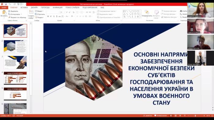 Із вступним словом до студентів-гуртківців звернулися керівниця гуртка кандидатка економічних наук Світлана Петровська та керівниця секції кандидатка економічних наук Людмила Парфентій. Студентка 4 курсу Євгенія Коваленко, яка навчається за спеціальністю «Право», виступила з доповіддю на тему «Основні напрями забезпечення економічної безпеки суб'єктів господарювання та населення України в умовах воєнного стану» (науковий керівник - кандидатка економічних наук Людмила Парфентій). У доповіді було висвітлено втрати українського бізнесу від війни, а також окреслено основні кроки до відновлення вітчизняного бізнесу під час війни.